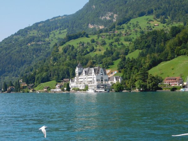 A tóparti kis település, ahol hajóra szálltunk, körben hegyekkel övezett, csodálatos kis villákkal beépített. A hegy tetejéről nem maradhatott el a svájci zászló.